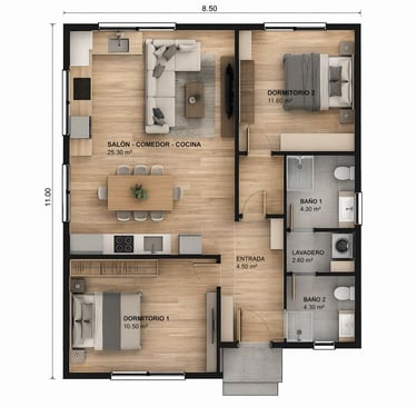 Vivienda moderna de una planta diseñada para ofrecer comodidad, eficiencia y aprovechamiento del espacio. Su distribución abierta conecta el salón, comedor y cocina en un único ambiente amplio y luminoso, ideal para el día a día.