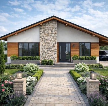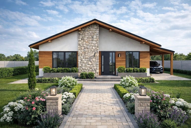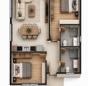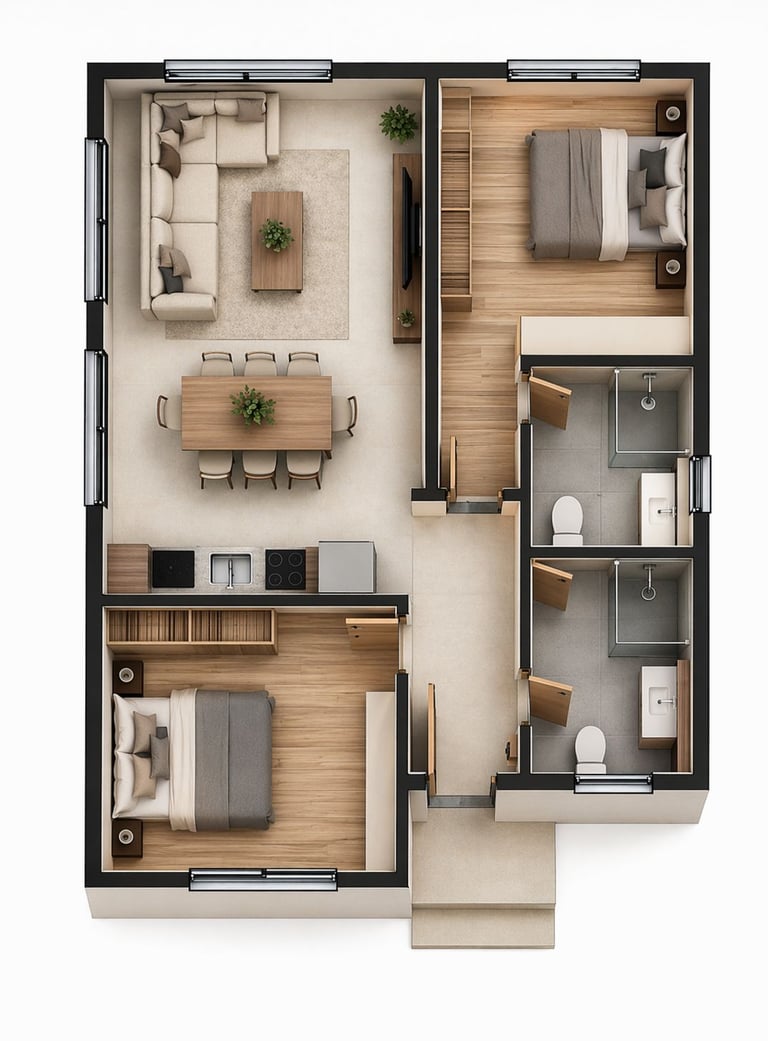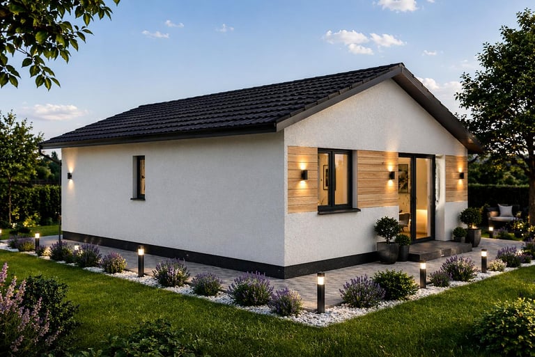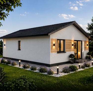 Vivienda unifamiliar de una planta, de diseño compacto y funcional, con clara separación entre zona de día y zona de noche. Destaca por su espacio central abierto y distribución eficiente.